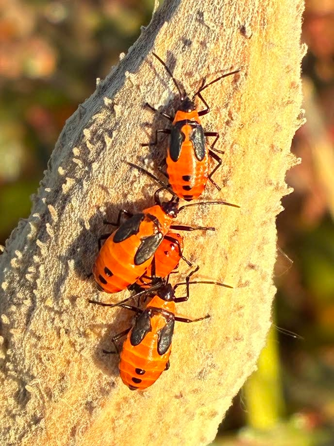 If you were checking for monarch butterfly caterpillars in mid- to late summer, you may have noticed clusters of small, bright orange insects on the developing milkweed pods. A closer look reveals these insects are the nymphs of the next generation of large milkweed bugs.